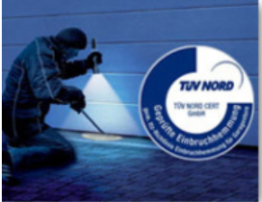 Les portes sectionnelles motorisées en acier sont homologuées par le TÜV (contrôle technique) et résistent à toutes tentatives d’intrusions. Toutes les portes sont dotées de protection anti-effraction avec des sections en acier stables à double paroi, de charnières en acier robuste entre les sections et les rails ainsi que d’une sécurité anti-soulèvement.